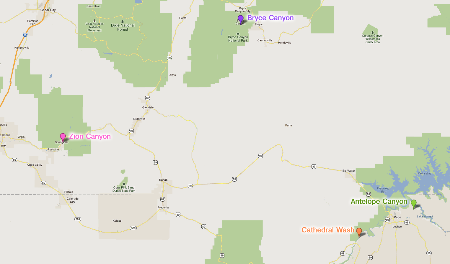 L’après-midi, nous avons fait une randonnée dans « Cathedral Wash », un canyon asséché se jetant dans le Colorado, situé à proximité du lac Powell. Le chemin est au début large et tranquille et devient de plus en plus escarpé au fur et à mesure que l’on s’enfonce dans le canyon. Nous ne sommes pas allés jusqu’au Colorado : comme le canyon devenait de plus en plus profond, nous étions obligés de marcher sur les parois de ce dernier et il était de plus en difficile de trouver notre chemin.